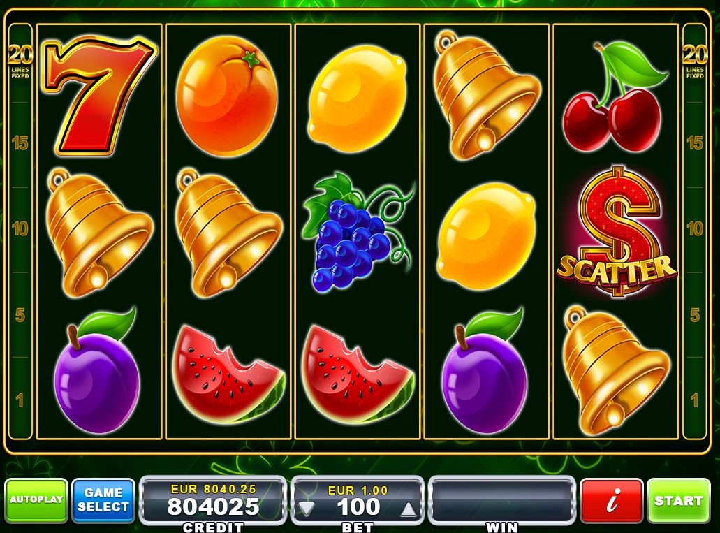 CLOVER 20 is a video slot game, controlled by random numbers with five rotating reels and 20 possible pay lines. Each of the 5 reels is marked with symbols and each time a play is made, the five reels stop at random. In the play window a selection of a total of 15 symbols is then shown (3 symbols per reel). The amount you win depends on certain symbol combi-nations and the amount you bid.